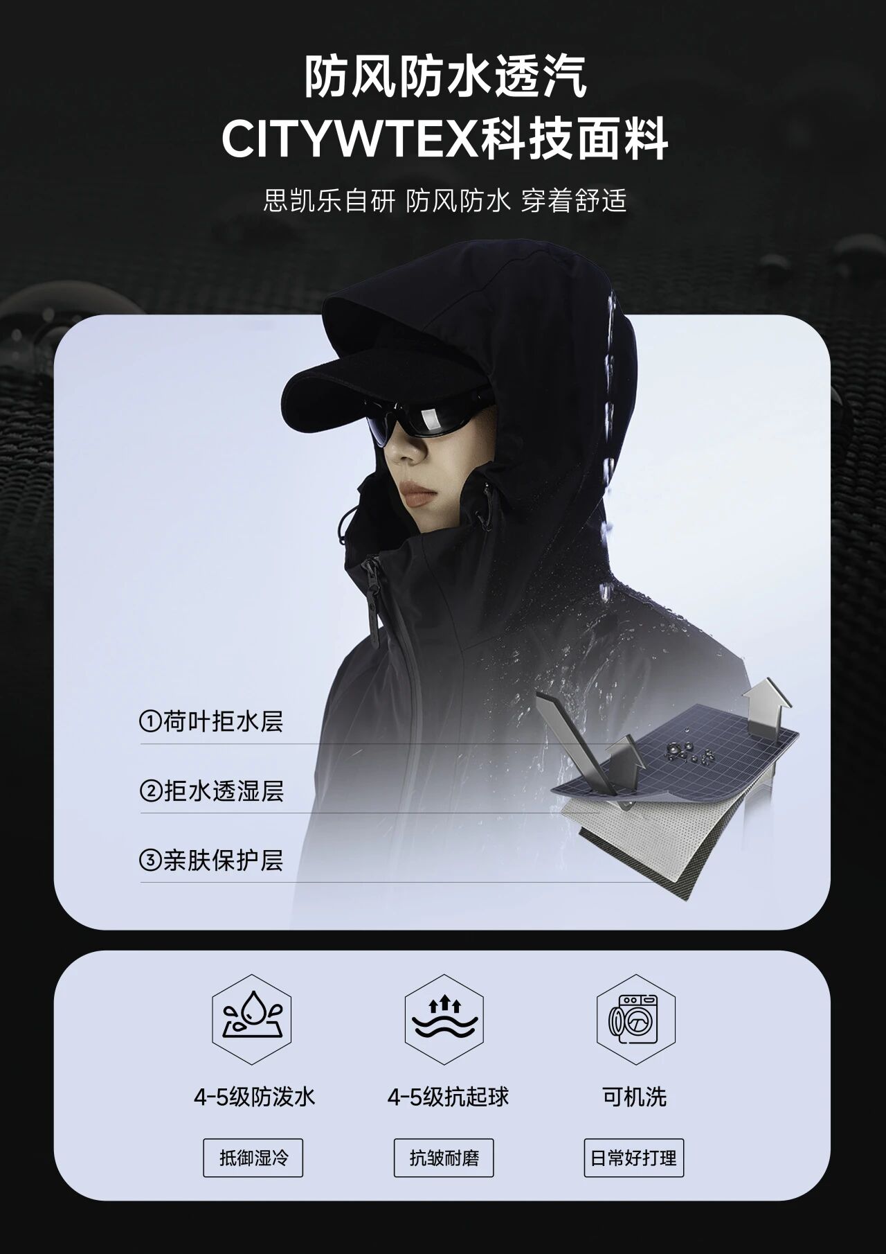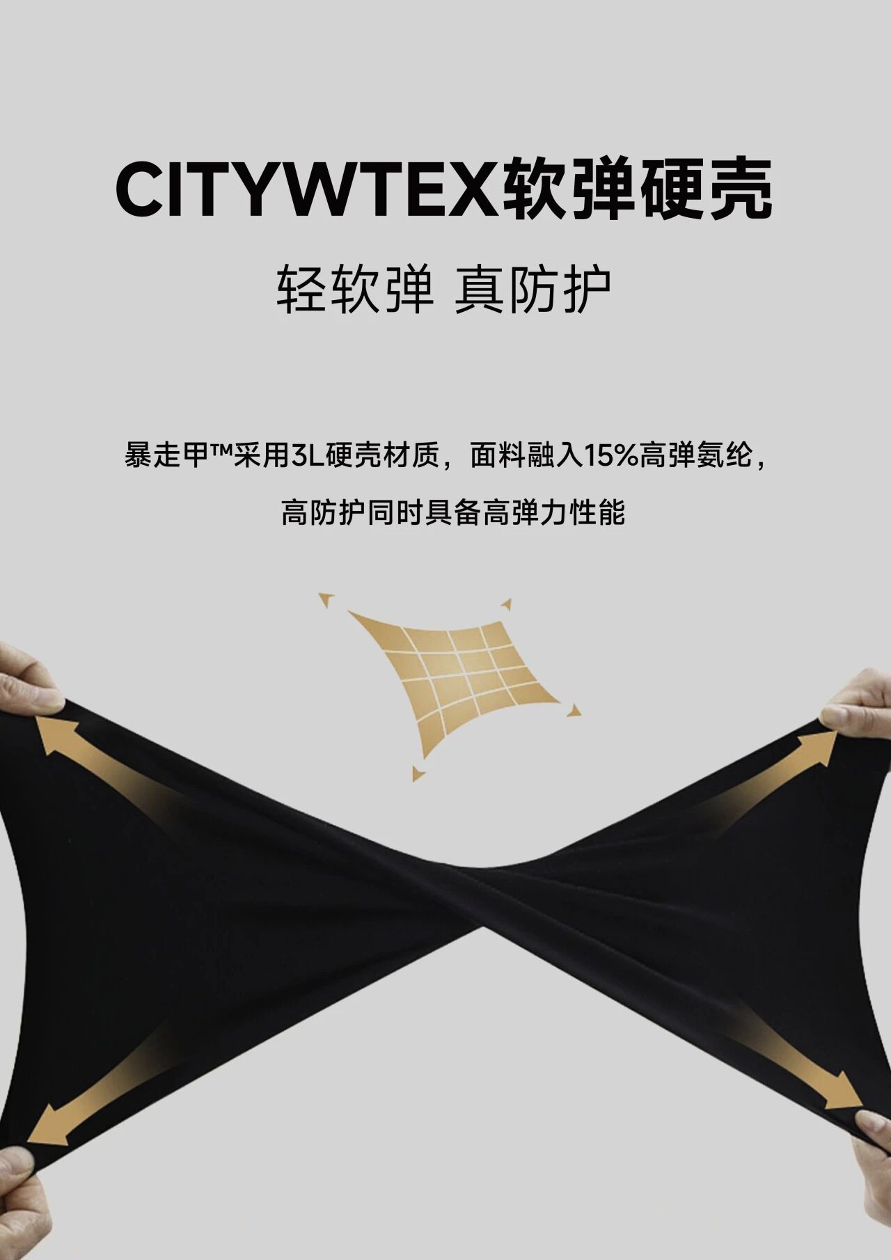 特别值得(de)一(yī)提的(de)是(shì),我們這(zhè)款衣服增加了(le)軟彈的(de)面料,讓硬殼也(yΩě)可(kě)以具有(yǒu)軟彈性能(néng),穿著(zhe)舒适性更強,這(zhè)是(shì)我們自(zì)己研發的(de)新科(kē)技(jì),叫Citywte≈x軟彈硬殼科(kē)技(jì)面料。